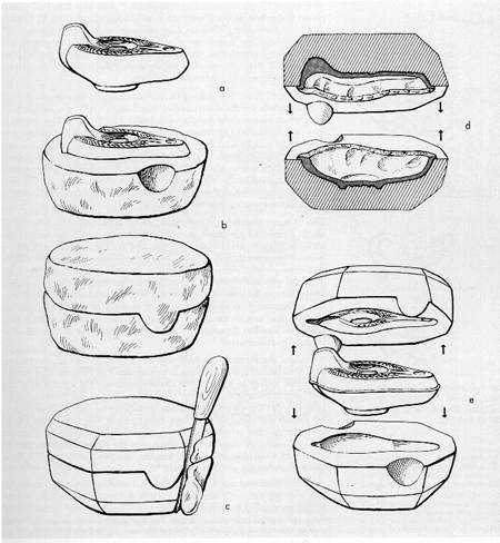 Making the mould itself: a) The patrix b) Making the mould in two halves c) Trimming the mould to shape Using the mould to make a lamp: d) Lining up the mould halves with clay already pressed inside to make a lamp e) Opening the mould to reveal the lamp formed inside |